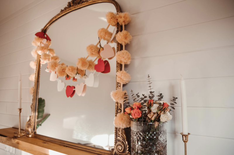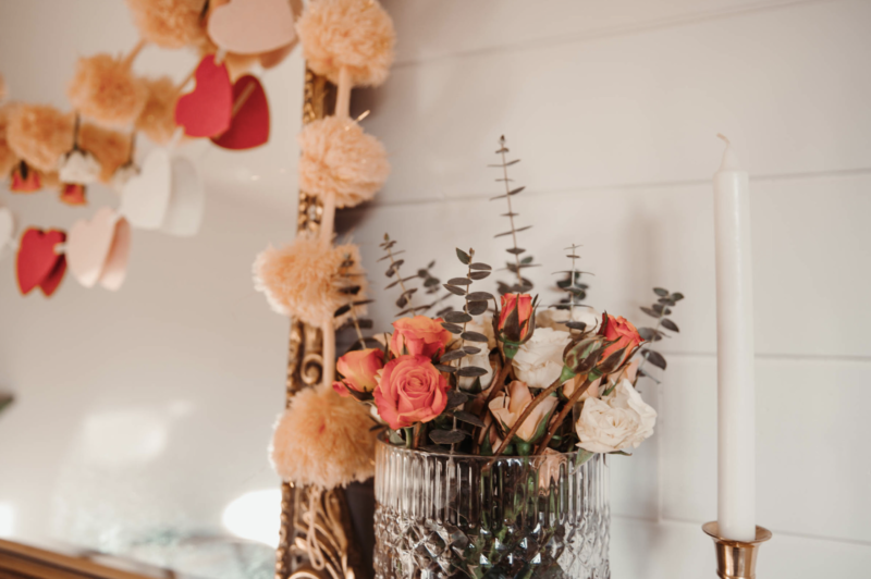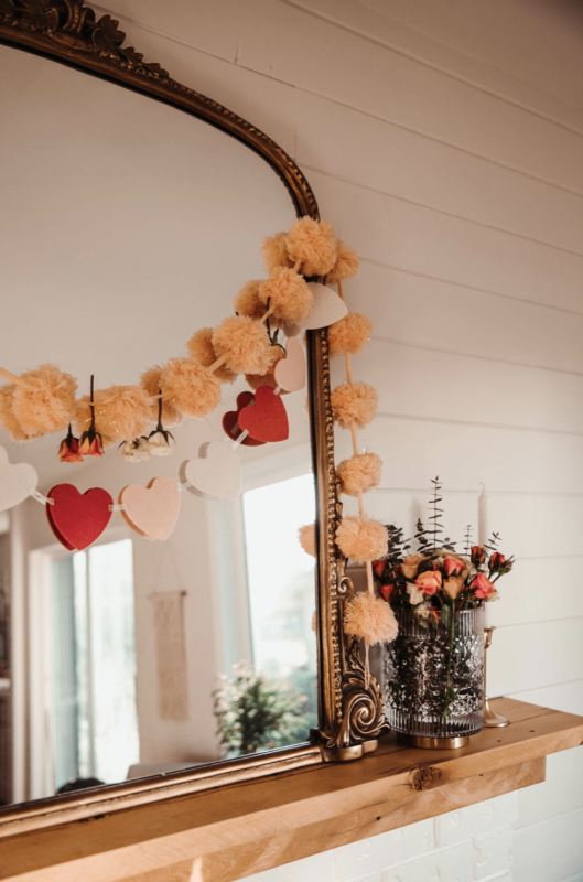 January felt like the longest month, it's been cold and dark and dreary. It feels so good to finally welcome February in. When the sun came out for several hours yesterday I was inspired to put something festive up over the mantle for Valentine's Day. We popped into Trader Joes after church for some mini roses and eucalyptus and I just grabbed my favorite anthropologie garland and a heart banner I picked up at Joann Crafts a few weeks ago from around the house.